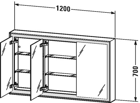 IP 44, 3 ante a specchio, illuminazione LED (su 4 lati), 4 ripiani in vetro (trasparente), parete posteriore interna a specchio, 1 presa di corrente con coperchio, all'interno a destra, 1 interruttore a sensore sotto a dx, funzione dimmer per LED, LED (durata >30.000 ore), diodi fissi, classe di efficienza energetica: A, modulo LED 3500 Kelvin di temperatura di colore, 52 W.