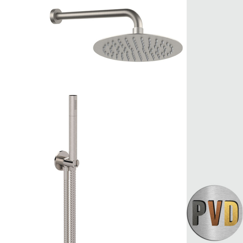 Set doccia a incasso in acciaio INOX spazzolato, composto da: soffione tondo in acciaio inox diam.20cm, braccio in acciaio inox 30 cm, presa acqua a muro con supporto doccetta, doccetta minimale in acciaio inox a 1 funzione, flessibile in PVC 150 cm. Set da completare con un miscelatore a incasso con deviatore
